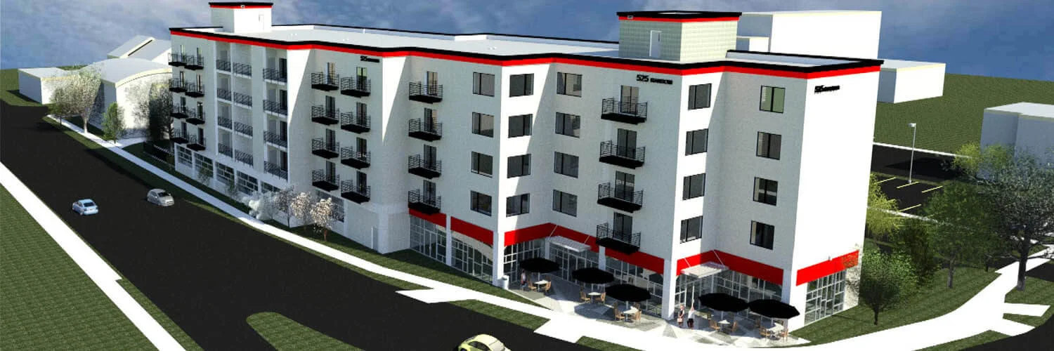 The project calls for new construction of a five-story building with 80 apartment units and a commercial space on the first floor. Four of the units will be two-bedroom units, and 76 will be one-bedroom units.