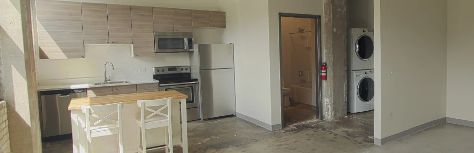 The Efficiency apartments include a complete kitchen, washer and dryer. The design is modern with brick and concrete and large windows to provide a large amount of natural light.