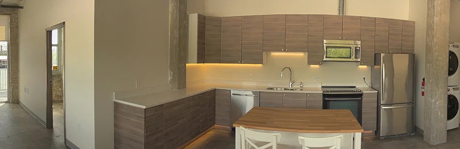 The two bedroom apartments include a complete kitchen, washer and dryer. The design is modern with brick and concrete and large windows with awesome city views of the area.